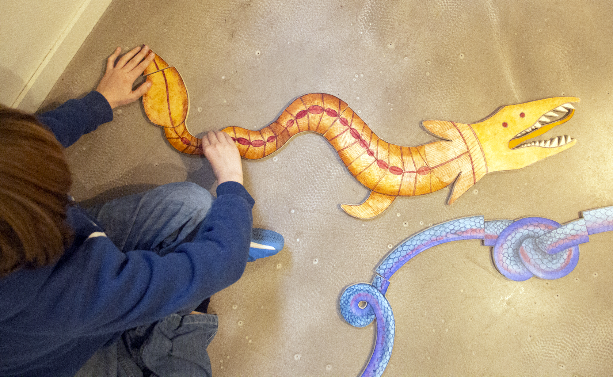 Ce jeu de puzzle créatif en bois peint se joue sur un tapis au sol. Il utilise huit serpents inspirés de divers pays et fractionnés chacun en huit morceaux que l’on mélange pour réaliser des êtres fantastiques : dragons, chimères.